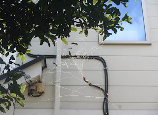 Our four little kittens have kept us busy and close to home. (They eat three times a day and need exercise and attention.) So, here's a spider's web in our bay laurel tree. Click to enlarge.
